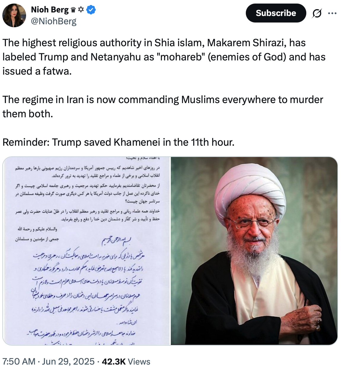 Now that this fatwa has been formally issued, Donald Trump, Benjamin Netanyahu and other high ranking Israeli officials are officially considered to be “Mohareb” from this point forward…