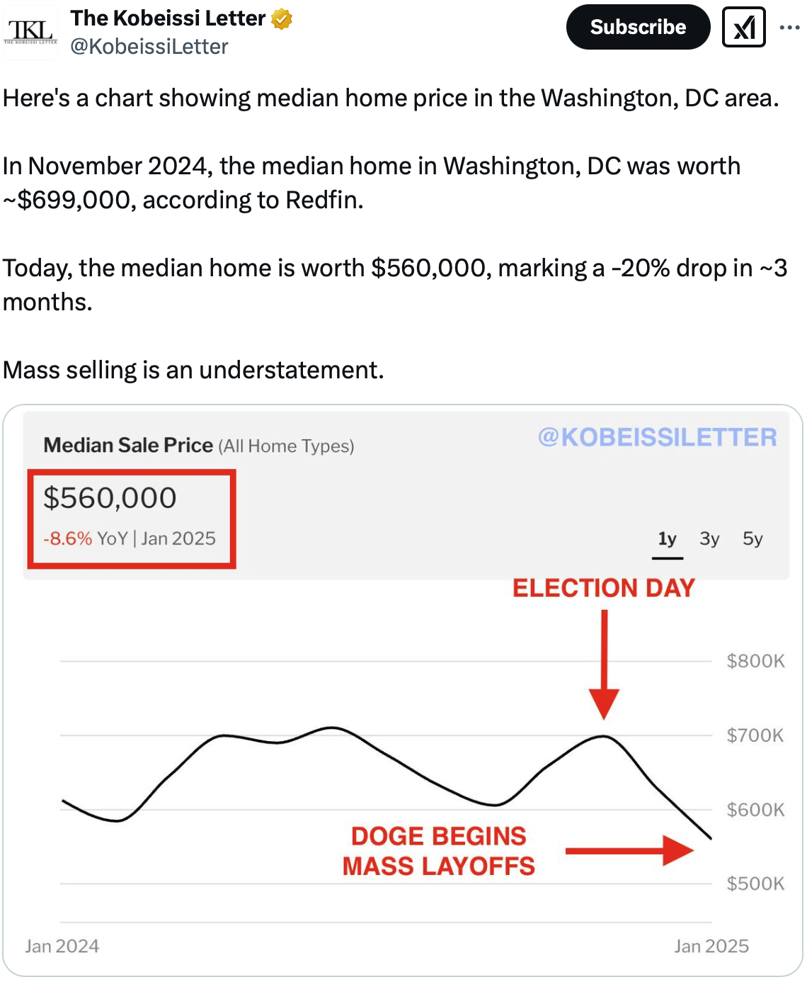 There has also been a surge in new listings of homes over $1 million. According to TKL, there are 525 listings worth $1 million and 44 listings worth $5 million, suggesting DOGE layoffs could affect people in high-profile jobs.