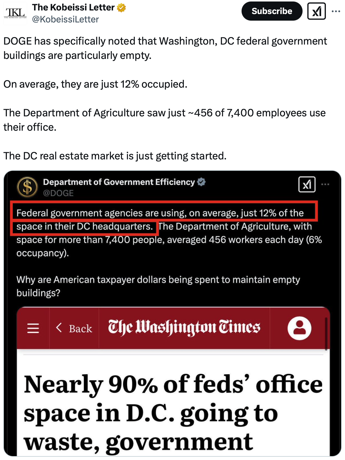 Elon Musk and his team are determined to get rid of office space that is not being utilized , and apparently the federal government currently has lots and lots of office space that is not being occupied.