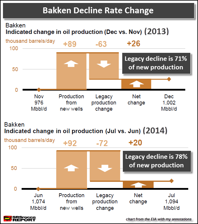 When the Bakken produced 89,000 bd of new production in Dec, 2013, the 63,000 bd decline rate was 71% of this total. The EIA estimates the decline rate in July at 72,000 bd, which is now 78% of the 92,000 bd of new production.