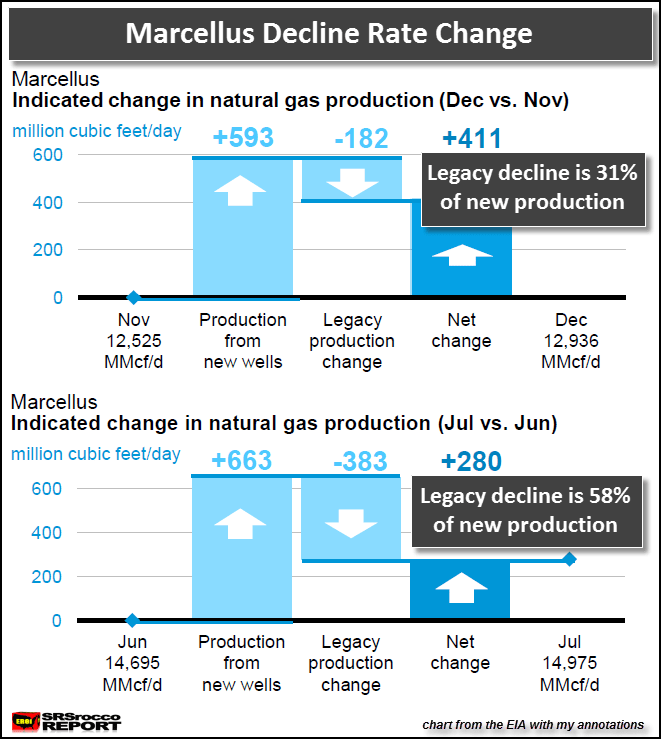 Back in Dec 2013, the Marcellus added 593 (mcf) million cubic feet per day of new natural gas production and suffered a decline rate from existing wells of 182 mcf with a net change of 411 mcf per day. This was a large amount of net new production at a 31% monthly decline rate.