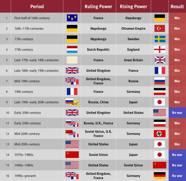 However, when Allison and his associates sifted the last 500 years of history to locate cases in which the rapidly growing power of a rising nation had threatened to overtake that of a dominant reigning one, they discovered that in well over half the examples—12 out of 16— the result had been war.