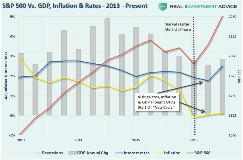Of course, as rates, inflation, and economic growth were rising by small amounts, investors pushed assets prices higher expecting the longest economic growth cycle on record to continue for another decade.