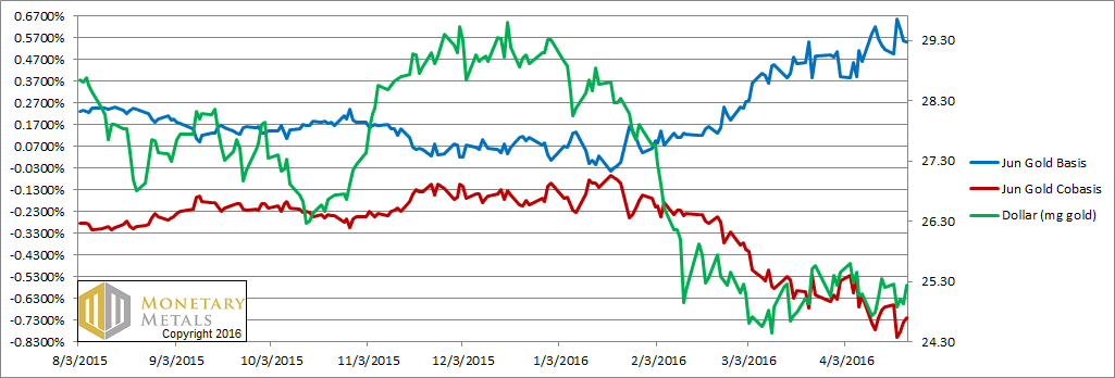 Look at that. Carrying gold for June delivery is now even more profitable, over 55 basis points. This is up from last week at 51bps. The increase tells us something. However much gold was carried last week, it became incrementally more attractive to carry this week.