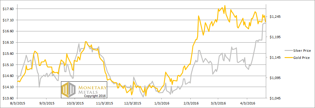 The growing consensus is bullish. As always, we’re more interested in the fundamentals than in opinions. Let’s look at the only true picture of supply and demand fundamentals. But first, here’s the graph of the metals’ prices.
