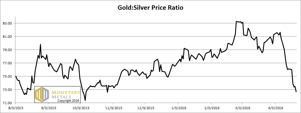 Next, this is a graph of the gold price measured in silver, otherwise known as the gold to silver ratio. The ratio was down sharply again this week.