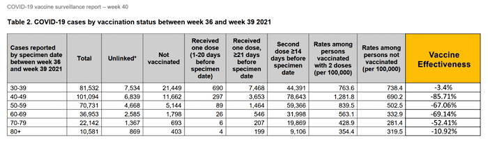 The efficacy of all available vaccines combined is as low as – 85.71% within the 40-49 age group, and as high as – 3.4% in the 30-39 age group. This shows that the Covid-19 vaccines are making people more susceptible to catching Covid-19, rather than preventing cases of Covid-19 by the claimed 95%. By combining the numbers provided for all age groups over the age of 30, we have been able to calculate an average vaccine effectiveness of – 47.69%, and we’re definitely seeing this in the number of confirmed cases by vaccination status.