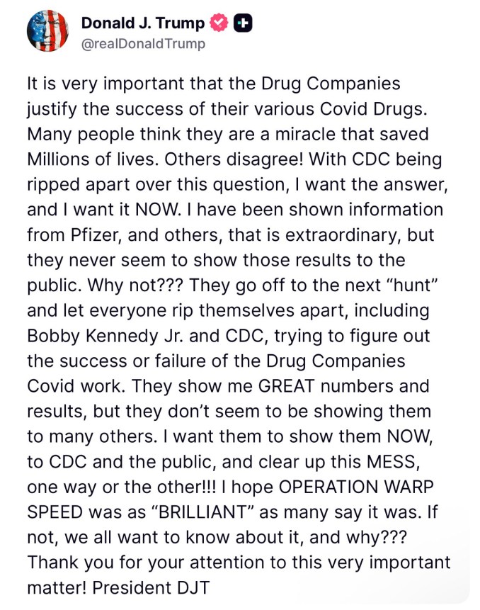 The Covid jab makers “show me GREAT numbers and results, but they don’t seem to be showing them to many others,” he wrote in a post on his Truth Social network. “I want them to show them NOW, to the CDC and public, and clear up this MESS, one way or the other!!!”